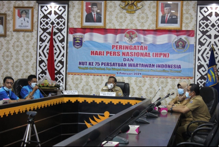 Jusinews, Kota Metro – Memperingati Hari Pers Nasional (HPN) sekaligus HUT ke-75 Persatuan Wartawan Indonesia (PWI), PWI Kota Metro mengikuti zoom metting secara virtual bersama Wali Kota Metro Achmad Pairin di Operasional Room Pemkot Metro, Selasa, 9/2/2021.