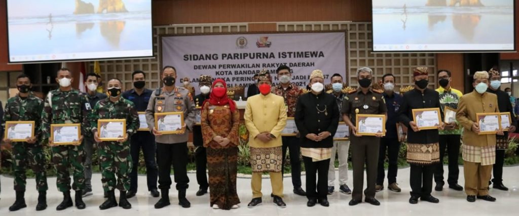 Dalam Rangka HUT Provinsi Lampung yang ke-57, Walikota Bandar Lampung Eva Dwiana yang didampingi Wakil Walikota Bandar Lampung Dedi Amarullah bersama DPRD Kota Bandar Lampung dan Forkopimda Bandar Lampung mengikuti Sidang Paripurna Istimewa secara virtual dengan DPRD Provinsi Lampung, Kamis,(18/3/2021) di Aula Gedung Semergou Sekretariat Pemerintah Kota Bandar Lampung.Seusai Acara Sidang Paripurna, Walikota Bandar Lampung juga memberikan penghargaan dan apresiasi kepada Instansi, Organisasi serta Perusahaan dan Media Massa yang berperan dalam menanggulangi CORONA VIRUS DISEASE 2019 (COVID-19) di Kota Bandar Lampung.Walikota Bandar Lampung berharap COVID-19 di Kota Bandar Lampung segera hilang dengan segala upaya Pemerintah dan masyarakat. (ir)