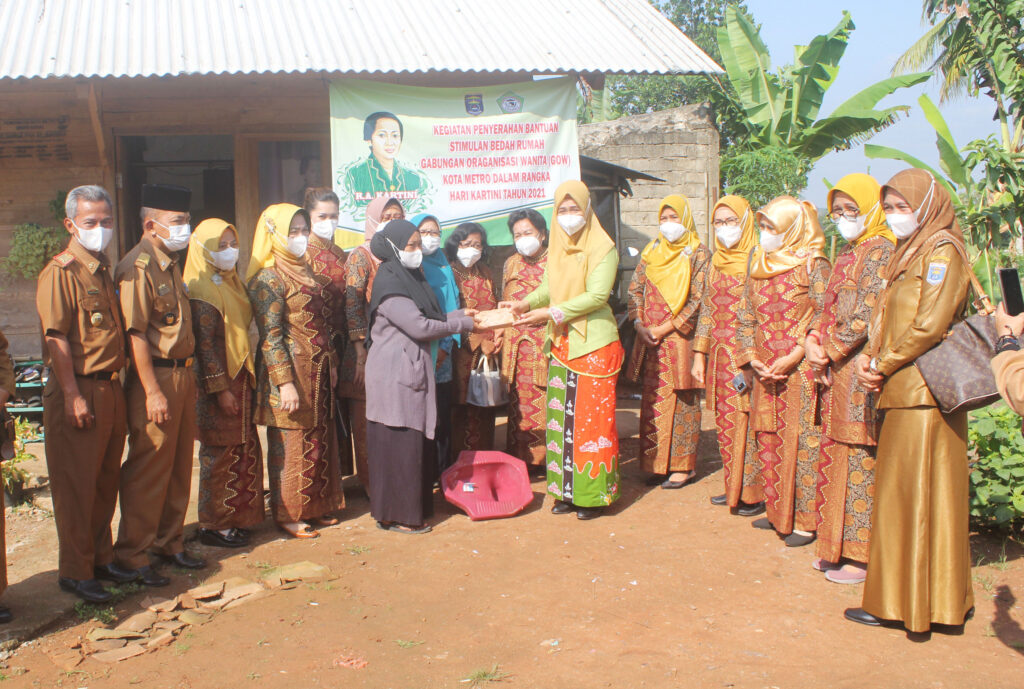 Dalam Rangka Hari Kartini 2021, Ketua TP PKK Kota Metro bersama dengan Ketua GOW Kota Metro beserta anggota, Kepala Dinas PPPAPP&KB Kota Metro, berikan bantuan secara simbolis kepada warga penerima bantuan stimulasi bedah rumah di 5 Kecamatan Kota Metro, Senin (03/05/2021).