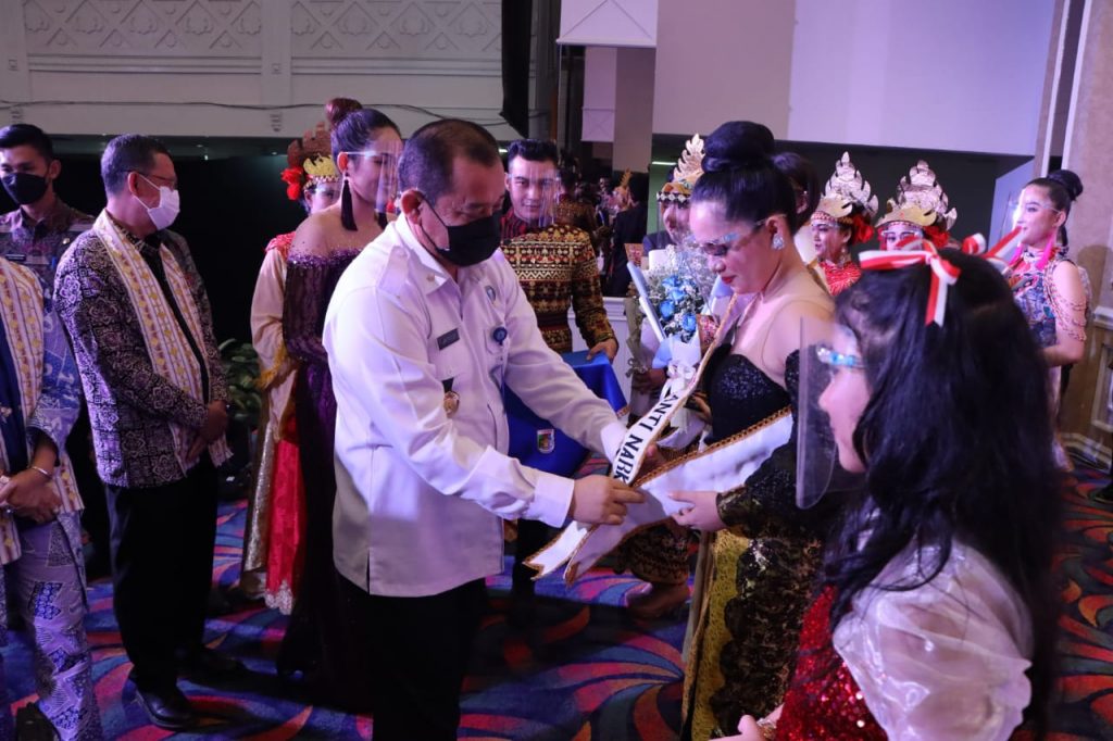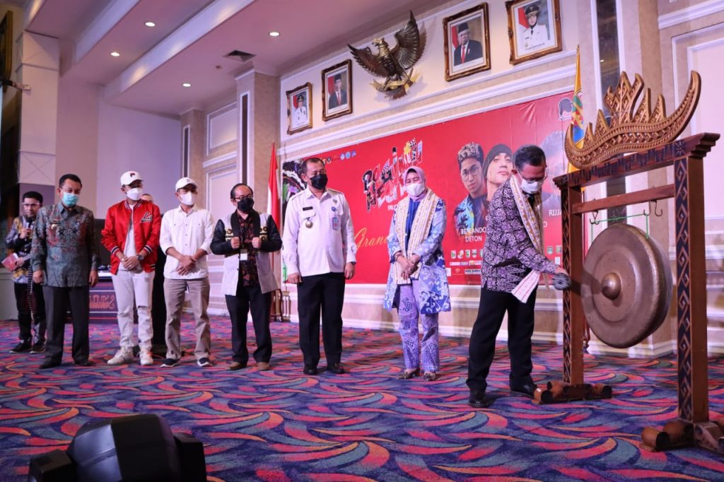 BANDARLAMPUNG—-Gubernur Lampung Arinal Djunaidi diwakili oleh Sekretaris Daerah Provinsi Lampung Fahrizal Darminto melakukan pemukulan Gong sebagai tanda secara resmi pembukaan ajang Grand Final Talent Hunting Bagimu Negri di Balai Keratun, Komplek Perkantoran Gubernur Lampung, Bandarlampung, Kamis (03/06/2021).
