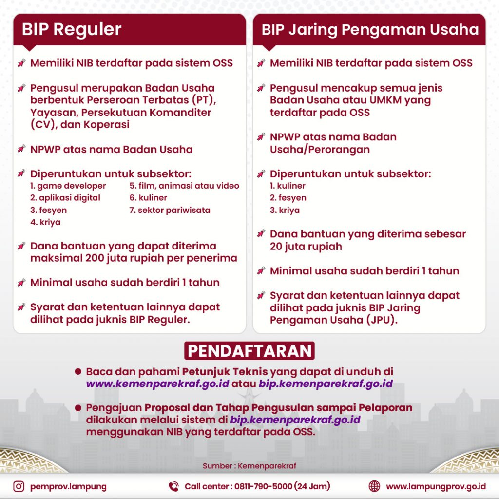 Program BIP diperuntukkan bagi 6 sektor usaha ekonomi kreatif dan Pariwisata. Untuk pendaftaran, unggah dokumen maupun pengisian proposal dapat langsung melalui website: Jangan lupa mengunduh Petunjuk Teknis BIP untuk mengetahui syarat, tahapan, tata cara pendaftaran, dan informasi penting lainnya terkait program BIP 2021 ini.