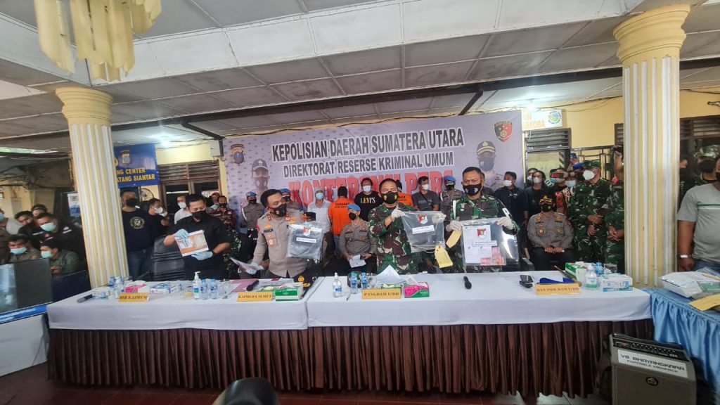 Pengungkapan kasus dugaan pembunuhan korban jurnalis Lesser News Today Mara Salem Harahap dipaparkan Kapoldasu Irjen Pol RZ. Panca Putra Simanjuntak di Mapolres Kota Pematangsiantar, Jl. Jend. Sudirman, Kamis (24/6) petang, terlihat dalam kegiatan Konfrensi Pers para Pejabat Utama Polda Sumatera Utara dan Kodam I /Bukit Barisan terlihat hadir seperti Dir Reskrimum Kombes Tatan Dirsan Admaja, S.I.K., Kabid Propam Polda Sumut, Kombes Pol Donal Simanjuntak. S.I.K., Kabid Humas Polda Sumut Kombes Pol Hadi Wahyudi, S.I.K., Danpomdam Kolonel Cpm Anggiat Napitupulu, S.H., Kapolres Simalungun Akbp Agus Waluyo., S.I.K., Kapolres Pematangsiantar Akbp Boy Sutan Binanga, S.I.K., Dandim 0207/ Simalungun Letkol. Inf Roly Souhoka., Kasubdit III Akbp Taryono Raharja, S.I.K., Kanit Buncil Jatanras Polda Sumut Kompol TP. Butar-Butar., SH. MH., Kasat Reskrim Polres Simalungun Akp. Rachmat Aribowo, S.I.K., M.H., Kanit Jatanras Ipda Antonyus Hutahayan SH, MH., serta personel Polres Simalungun.(joe)