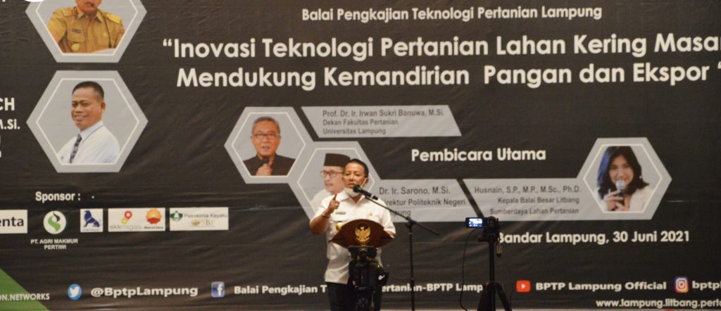Dalam sambutan Gubernur Arinal Djunaidi, menyambut baik diselenggarakannya Seminar Nasional ini, semoga dapat memberikan inspirasi baru bagi kebijakan pangan di Lampung khususnya yang terkait dengan inovasi teknologi pangan di lahan kering.