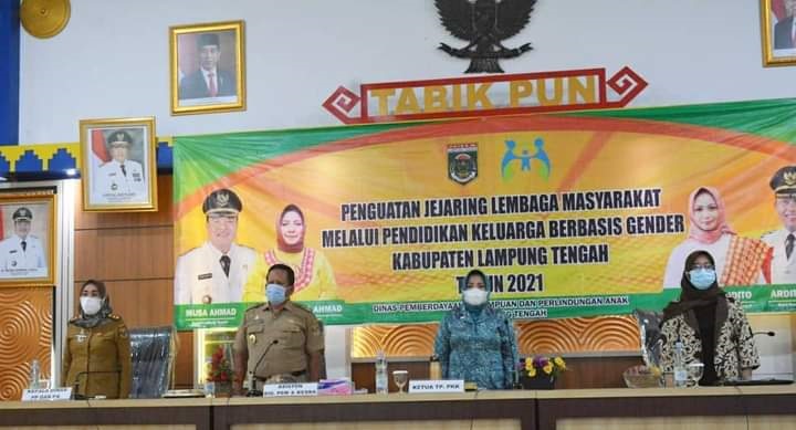 Gunung Sugih – Buapti Lampung Tengah yang diwakili Asisten Bidang Pembangunan dan Perekonomian Drs. Eko Dian Susanto, M.I.P. membuka acara Penguatan Jejaring Lembaga Kemasyarakatan Keluarga Berbasis Gender Kabupaten Lampung Tengah. Acara tersebut berlangsung di Aula Siger Pemda Lampung Tengah Lantai 4 dan diikuti oleh perwakilan dari seluruh organisasi wanita yang ada di Lampung Tengah Selasa, 6 Juli 2021. Dalam sambutannya Bupati Lampung Tengah yang disampaikan oleh Asisten Bidang Pembangunan dan perekonomian mengatakan gender menjadi isu penting dan sering diperbincangkan di masa yang lalu orang bilang emansipasi wanita kesamaan antara hak dan kewajibannya antara lelaki dan perempuan beliau juga mengatakan dalam hal ini konsep gender adalah kesenjangan antara perempuan dan laki-laki dalam keperluan akses, partisipasi, kontrol dan pemanfaatan hasil pembangunan dengan fenomena tersebut maka dipandang perlu untuk meberikan pelayanan keluarga berbasis gender.