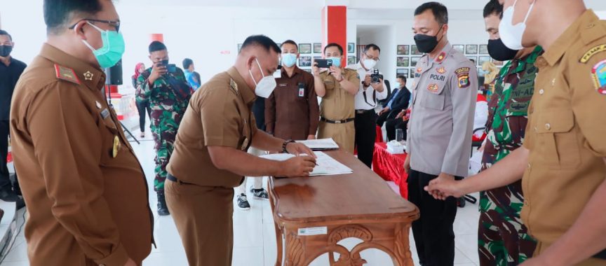 KALIANDA – Bupati Lampung Selatan, H. Nanang Ermanto lakukan MoU Penandatanganan Nota Kesepatakan Bersama antara Pemerintah Daerah Kab. Lamsel dengan Instansi Vertikal Kepolisian Resor Lampung Selatan, KODIM 0421 Lamsel serta Perguruan Tinggi IIB Darma Jaya, UML, UMITRA dan UTB di Aula Sebuku Rumah Dinas Bupati Lamsel, Selasa (6/7/2021).