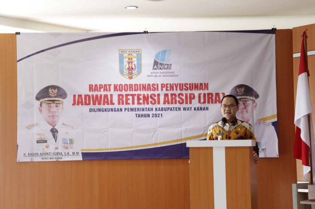 al tersebut dikatakan Sekretaris Daerah Kabupaten, Saipul, S.Sos.,M.IP saat menyampaikan sambutan Bupati H. Raden Adipati Surya, S.H.,M.M pada Rapat Koordinasi Penyusunan Jadwal Retensi Arsip (JRA) di Ruang Rapat Utama Pemkab Way Kanan, Kamis (03/11/2021) yang dihadiri oleh Kabid Pengelolaan Arsip Dinas Perpustakaan dan Kearsipan Provinsi Lampung, kepala/unsur Badan Kepegawaian dan Pengambangan SDM, Badan Pengelola Keuangan dan Aset Daerah, Badan Penanggulangan Bencana Daerah, Kesatuan Bangsa dan Politik, Dinas Pemuda, Olahraga dan Pariwisatam Dinas Pemberdayaan Perempuan, Perlindungan Anak, Pengandalian Penduduk dan Keluarga Berencana, Dinas Penanaman Modal dan Pelayanan Terpadu Satu Pintu, Dinas Pemberdayaan Masyarakat dan Kampung, Dinas Perpustakaan dan Arsip, Bagian Organisasi, Bagian Pengadaan Barang dan Jasa serta Bagian Tata Pemerintahan Setdakab.