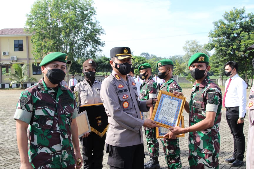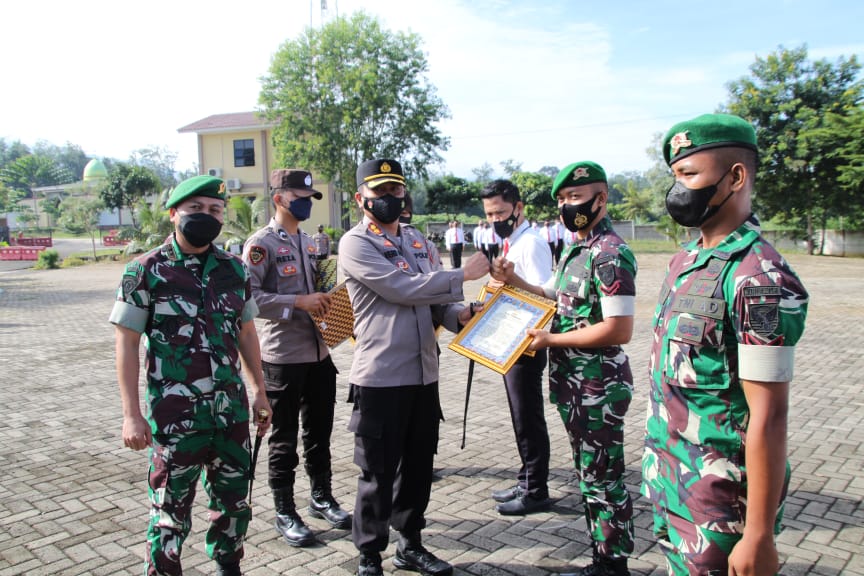 Bandar Lampung, Tiga orang Prajurit Yonif 143/TWEJ dari Kompi Bantuan Serda Laksana Keliat, Serda Rhaka Kurniawan dan Serda Fahrudin Yusuf, senin (13/12/2021) menerima penghargaan dari Kapolres Pesawaran AKBP Vero Aria Radmantyo, S.Ik, M.H, bertempat dilapangan Apel Mapolres Pesawaran.
