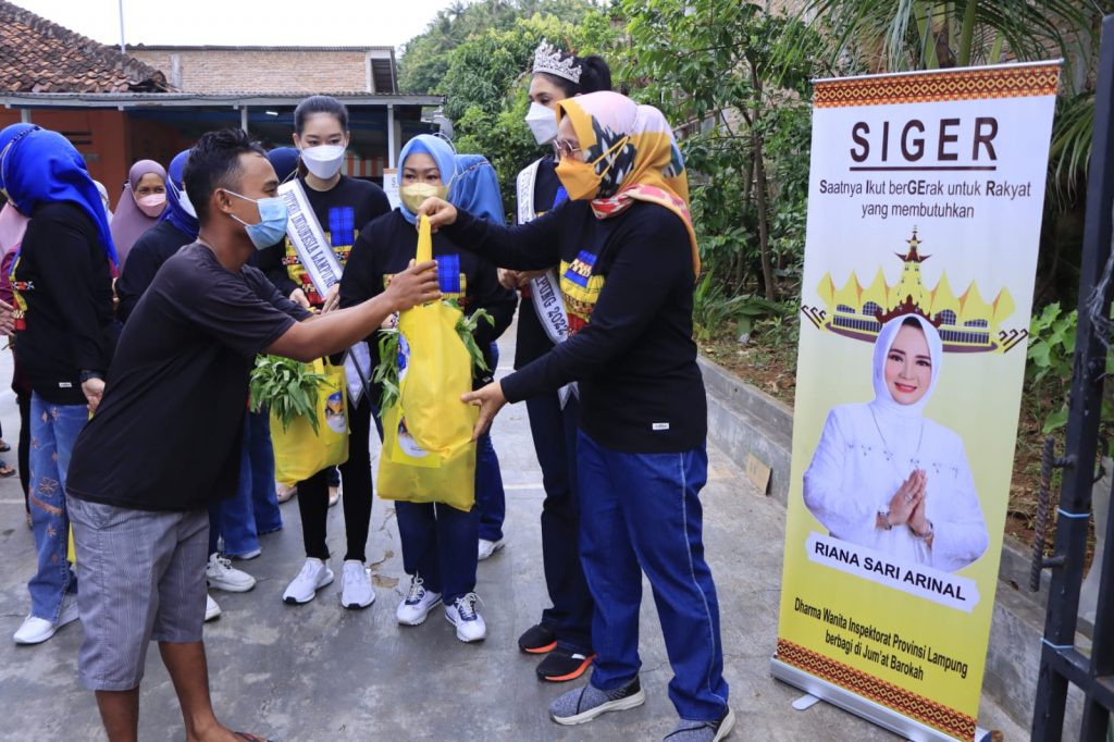 Bandar Lampung, — Ketua TP. PKK Provinsi Lampung,  Riana Sari Arinal didampingi Finalis Puteri Indonesia asal Provinsi Lampung  Feby Annisa  dan Puteri Indonesia favorit Irene Garcia menyalurkan bantuan kepada masyarakat dalam   gerakan SiGeR, bertempat di Jl. Nuri kelurahan Pengajaran Bandar Lampung,  Rabu (09/02/2022).