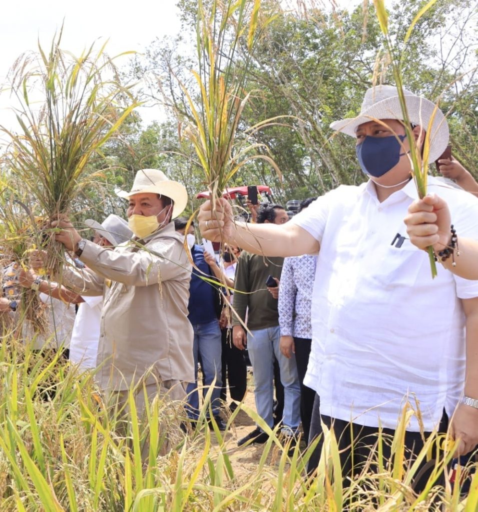 TUBABA—Kunjungan kerja ke Provinsi Lampung, Menteri Koordinator Bidang Perekononian RI Airlangga Hartarto dan Gubernur Lampung Arinal Djunaidi Panen Perdana Padi Gogo pada Proyek Penelitian Padi Gogo PT. Huma Indah Mekar, di Desa Penumangan, Kabupaten Tulang Bawang Barat, Sabtu (12/02).