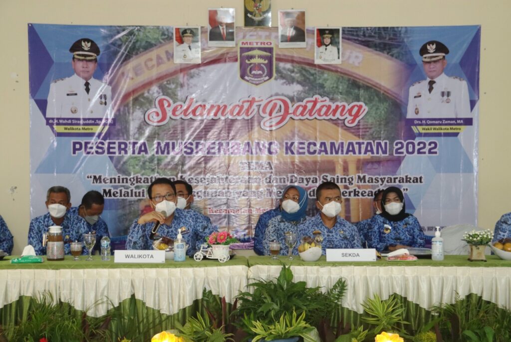 Penyusunan Rencana Kerja Pemerintah Daerah (RKPD) Tahun 2023 Camat diharapkan dapat terus melakukan proses pembangunan yang merata dan berkeadilan menuju kesejahteraan sehingga Metro memiliki daya saing tersendiri, demikian yang disampaikan Walikota Metro Wahdi saat menghadiri Musyawarah Perencanaan Pembangunan (Musrenbang) Kecamatan T.A 2022 yang berlangsung di Metro Timur, Kamis (17/02/2022).