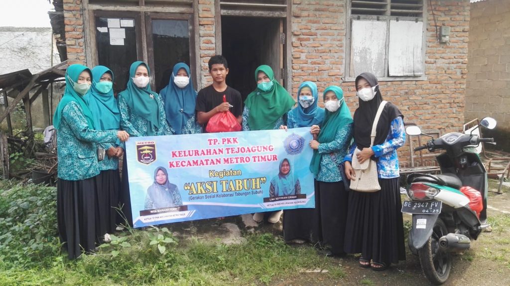 Dari hasil donasi dibelanjakan dalam bentuk sembako sebanyak 15 paket. Adapun sasaran Tabuh adalah anak yatim/piatu yang ada dikelurahan Tejo Agung. Dalam kegiatan Tabuh Tejo Agung didampingi oleh Pokja I TP-PKK Kota Metro dalam hal ini diwakilkan oleh Ibu Verdalena Hasan, SKM, M.Kes , Ketua TP-PKK Kecamatan Metro Timur Ibu Rita Mariana Ferry berserta ketua TP-PKK Kelurahan Tejo Agung Ibu Lina Septriani S.Pust beserta anggota TP-PKK Kelurahan Tejo Agung berkesempatan juga penyuluh agama islam Tejo Agung Ibu Siti Nurjanah,S.Ag, dan PSM Tejo Agung.
