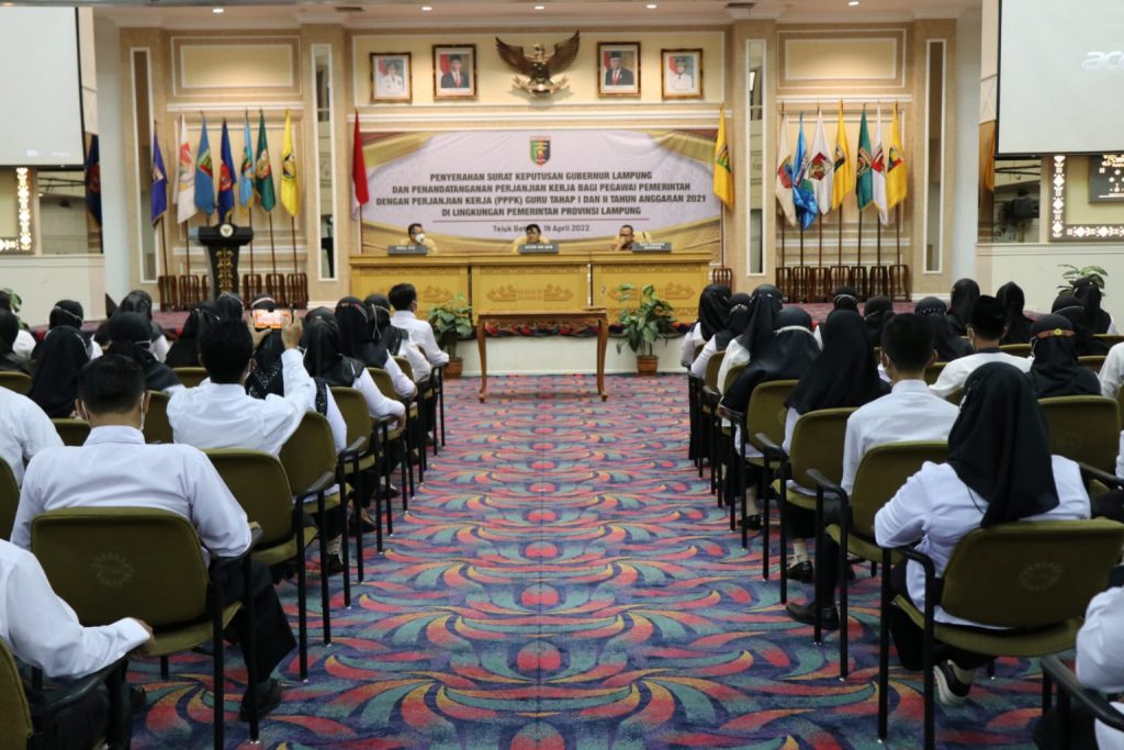 BANDARLAMPUNG – Gubernur Lampung Arinal Djunaidi diwakili oleh Asisten Administrasi Umum Minhairin, melakukan Penyerahan Surat Keputusan (SK) dan Penandatanganan Secara Simbolis Surat Perjanjian Kerja Pegawai Pemerintah Dengan Perjanjian Kerja (PPPK) Guru Tahap I dan Tahap II di Lingkungan Pemerintah Provinsi Lampung Tahun Anggaran 2021, di Balai Keratun Lt.III, Bandar Lampung, Selasa (19/04/2022).
