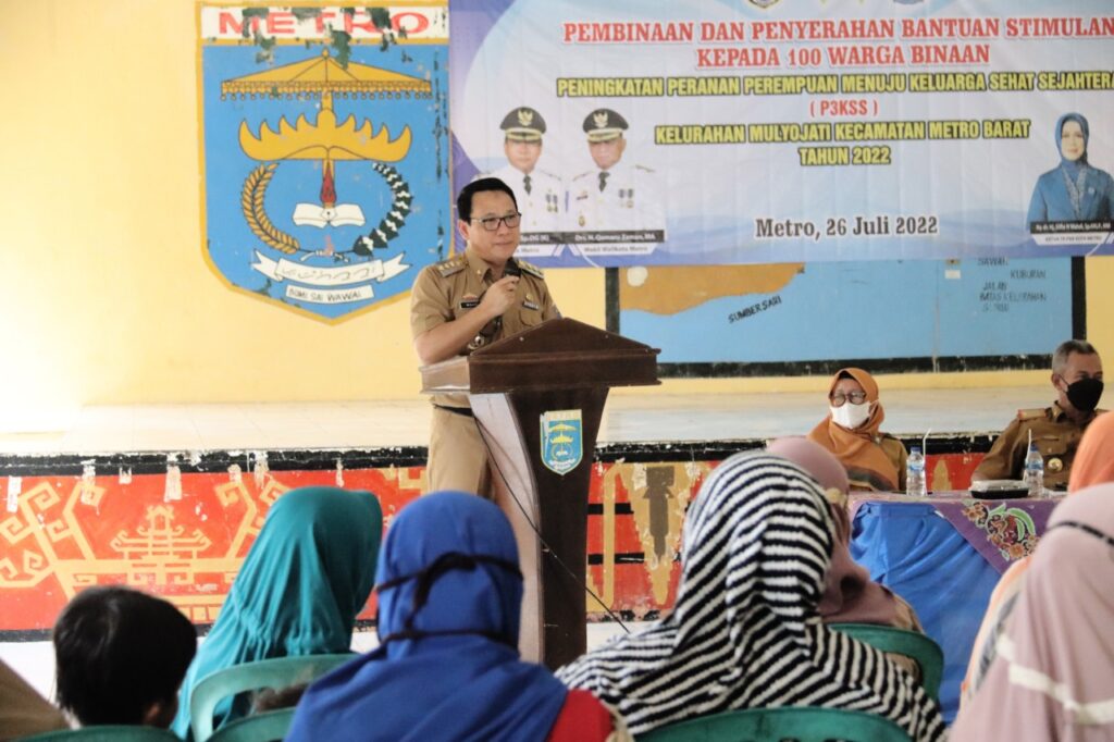 Walikota Metro bersama Wakil Walikota Metro menghadiri pembinaan dan penyerahan bantuan stimulan kepada 100 warga binaan pada Peningkatan Peranan Perempuan Menuju Keluarga Sehat Sejahtera (P3KSS) Kelurahan Mulyojati, yang berlangsung di Aula Kelurahan Mulyojati, Selasa (26/06/2022).