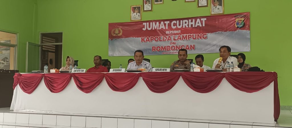 Polres Metro Polda Lampung – Direktur Kriminal Khusus Polda Lampung Kombes Pol Donny Arief Praptomo, S.IK., M.H yang dalam hal ini di wakilkan oleh DLH KBO AKBP Handak Prakasa Qalbi, S.T., M.H. didampingi Kapolres Metro AKBP Heri Sulistyo Nugroho S.I.K., M.I.K, mendengarkan keluhan masyarakat Kota Metro secara langsung melalui kegiatan “Jumat Curhat” yang di gelar di Aula Kel. Yosodadi Kec. Metro Timur Kota Metro, Jumat (25/08/23).