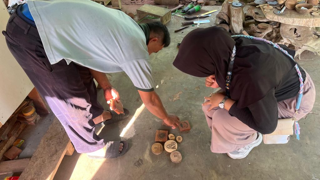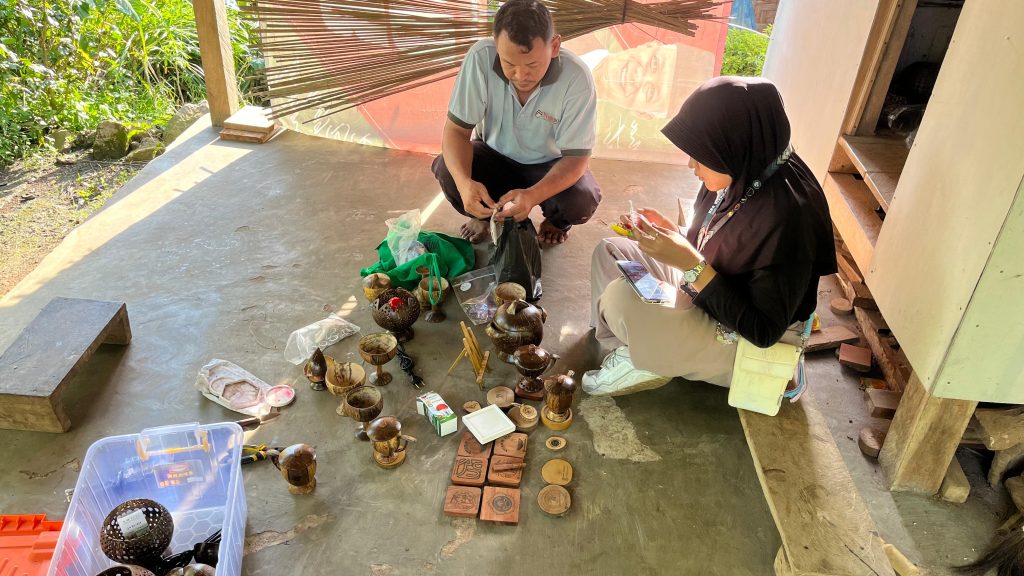 Proses pembuatan kerajinan batok kelapa dan kayu dilakukan oleh pengrajin lokal yaitu Pak Marna. Produk akhir meliputi gantungan kunci, gelas, mangkuk, asbak, lampu meja, dan tatakan gelas yang menampilkan desain baru tersebut. Ukiran pada produk batok kelapa dan kayu, diukir menggunakan mesin leser. Namun produknya merupakan hasil karya dari tangan Pak Marna sendiri. Desain tersebut juga diaplikasikan pada kaos dan gantungan kunci akrilik menggunakan teknik cetak berkualitas tinggi untuk memastikan hasil yang tajam dan tahan lama.
