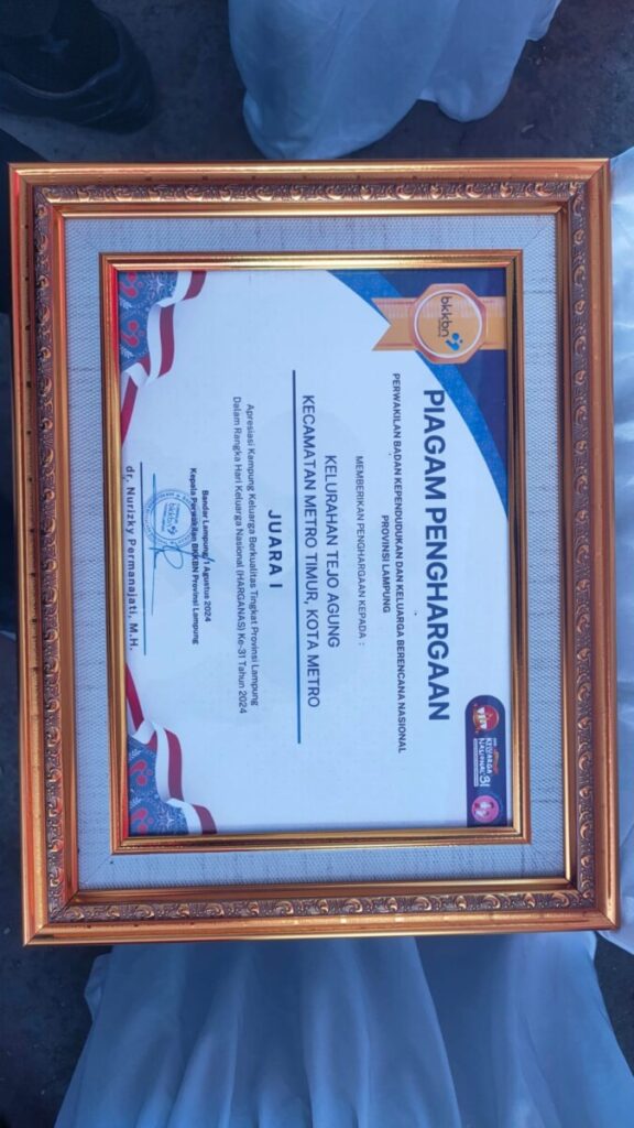 Metro Timur, 1 Agustus 2024 – Camat Metro Timur, Ferry Handono, mendampingi Lurah dan Kader Tejoagung dalam menghadiri penyerahan penghargaan Juara 1 Lomba Kampung Keluarga Berkualitas (KB) Tingkat Provinsi Lampung Tahun 2024. Penghargaan tersebut diberikan kepada Kampung KB Tejoagung, Kecamatan Metro Timur. Acara penyerahan penghargaan dilaksanakan di Kantor Perwakilan BKKBN Provinsi Lampung, Teluk Betung, Bandar Lampung.